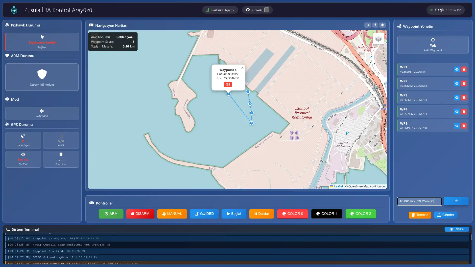 Custom-built Ground Control Station software for real-time communication with unmanned surface vehicle (USV). Features include telemetry, mission planning, and interactive mapping.